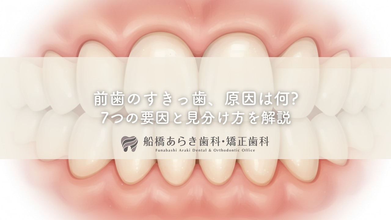 前歯のすきっ歯には、遺伝・歯の大きさ・上唇小帯・舌癖・歯周病・歯ぎしり・抜歯後の後戻りなど、さまざまな原因があります。