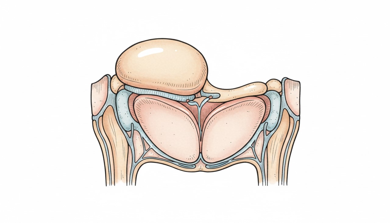 顎関節は耳の穴の少し前に位置し、下顎骨の「下顎頭」と側頭骨の「側頭腔」、その間に挟まれた「ディスク」と呼ばれる軟骨から構成されています。咀嚼・嚥下・会話といった日常動作で生じるストレスを分散させる重要な役割を果たしているため、負担が蓄積すると症状が現れやすくなります。