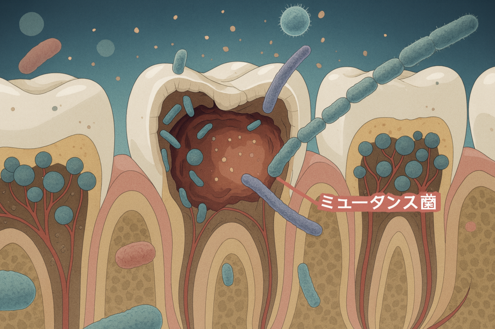 虫歯の主な原因は、歯の表面に付着する「歯垢(プラーク)」に含まれる細菌です。この細菌が糖分を餌にして酸を作り出し、歯の表面を溶かしていきます。