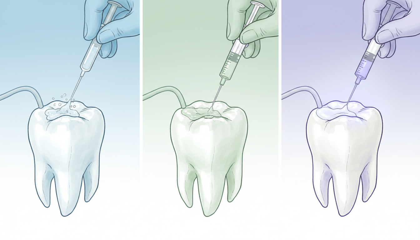この段階で歯が唾液で汚染されないよう注意が必要です。完全に乾いた状態に保つことができない場合は、処置方法を変更する必要があります。