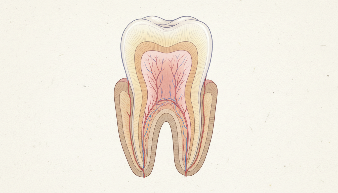 象牙質は、歯の表面を覆うエナメル質の内側にある組織で、無数の小さな穴(象牙細管)が神経に向かって伸びています。通常、エナメル質や歯茎によって守られているため、外部の刺激が直接神経に届くことはありません。